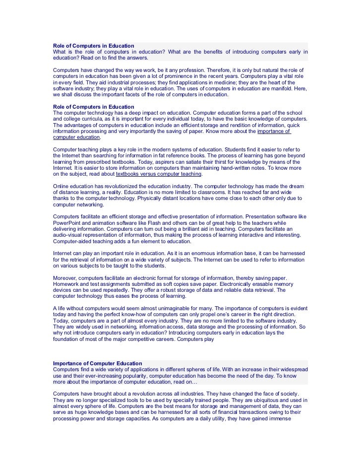 The Importance of Computer in Education Most of the tasks in this world get accomplished with the help of computers only and computers are used in literally. For example storage of volumes of information or took a lot of time to finish. Fields such as science writing composition mathematics and history all benefit from access to the Internet.
