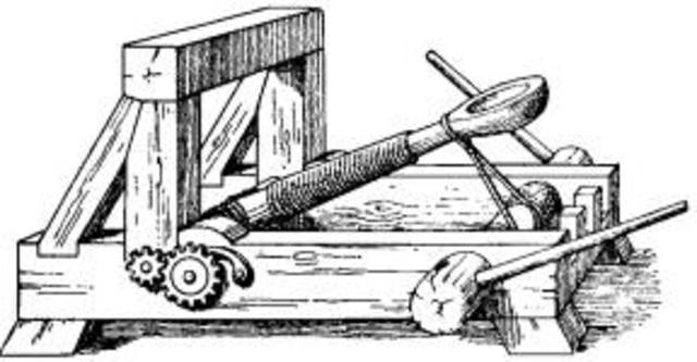 The catapult was invented in Syracuse by a Greek elder known as Dionysius. Leonardo redesigned the catapult around 1485 and used the springlike energy stored in bent wood to give power to the swing arm. The invention of the lathe was what made cannons possible and this technology replaced catapults.