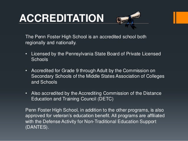 Penn Foster High School is accredited nationally by the Distance Education Accrediting Commission DEAC and regionally by the Commission on Secondary Schools of the Middle States. Penn Foster is accredited by the Distance Education Accrediting Commission DEAC.